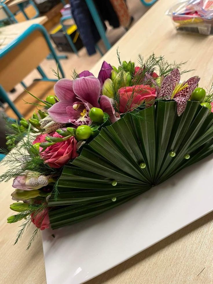 La composition moderne en forme d’éventail est une création florale audacieuse, captivante par son design contemporain. Voici une description de cette composition, où l’art floral se conjugue avec l’esthétique moderne pour créer une œuvre unique et éblouissante :
